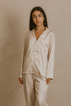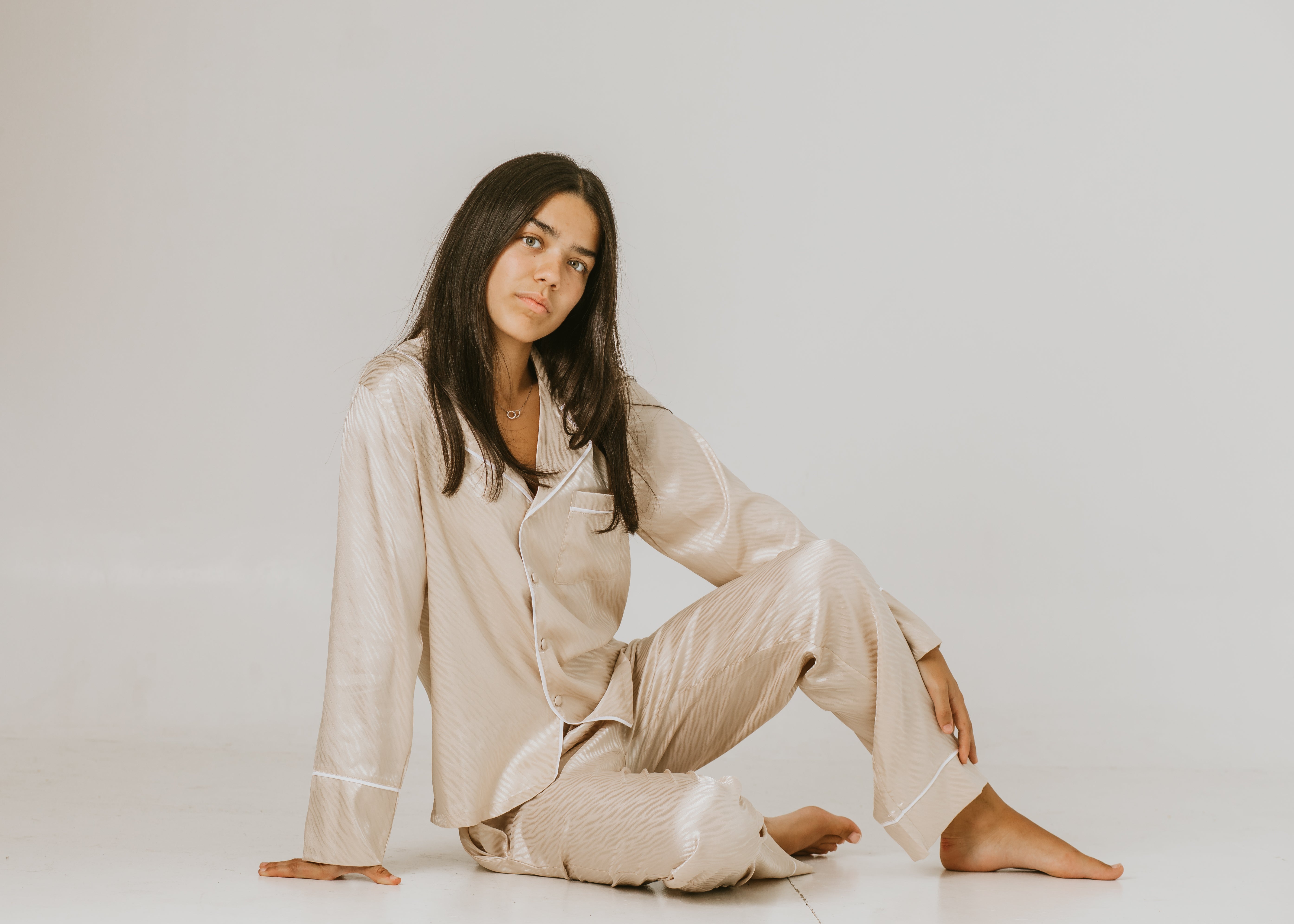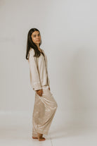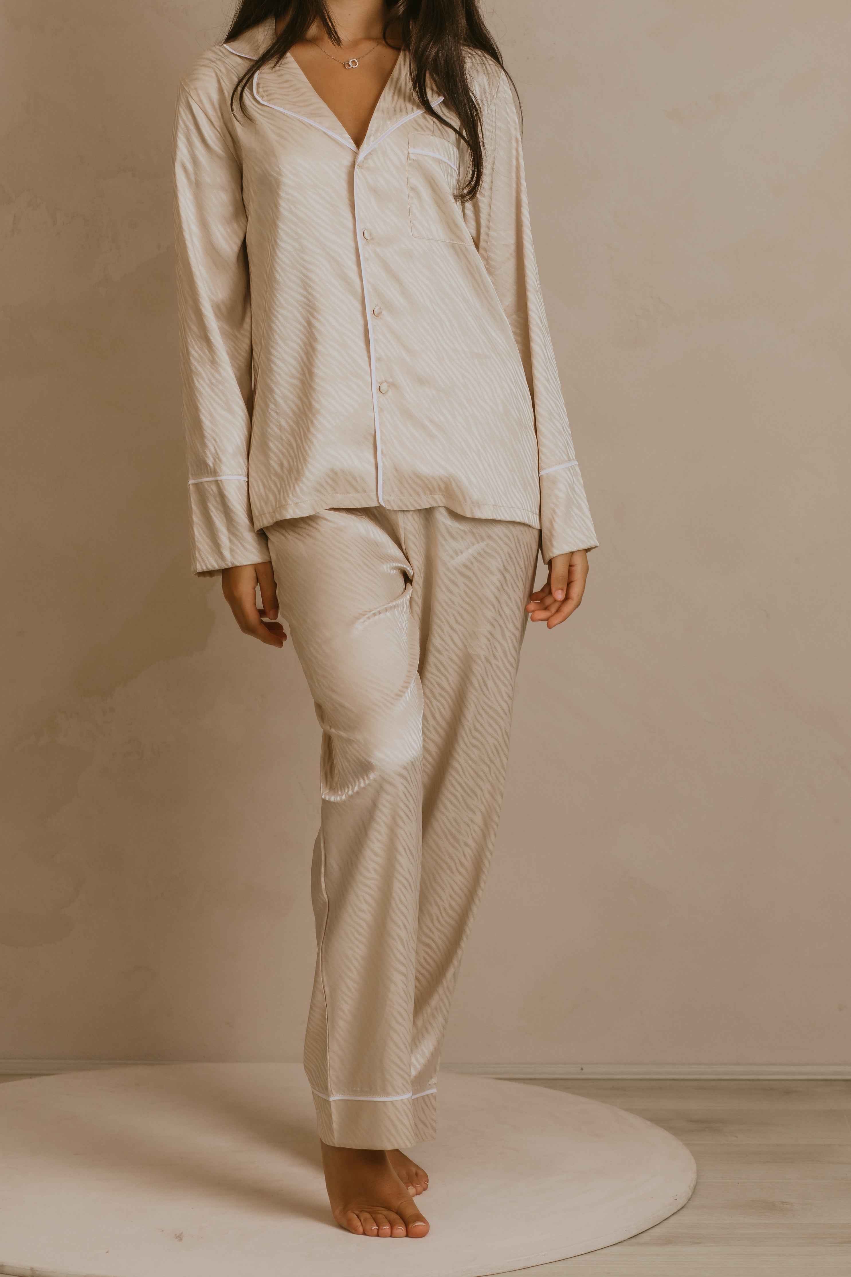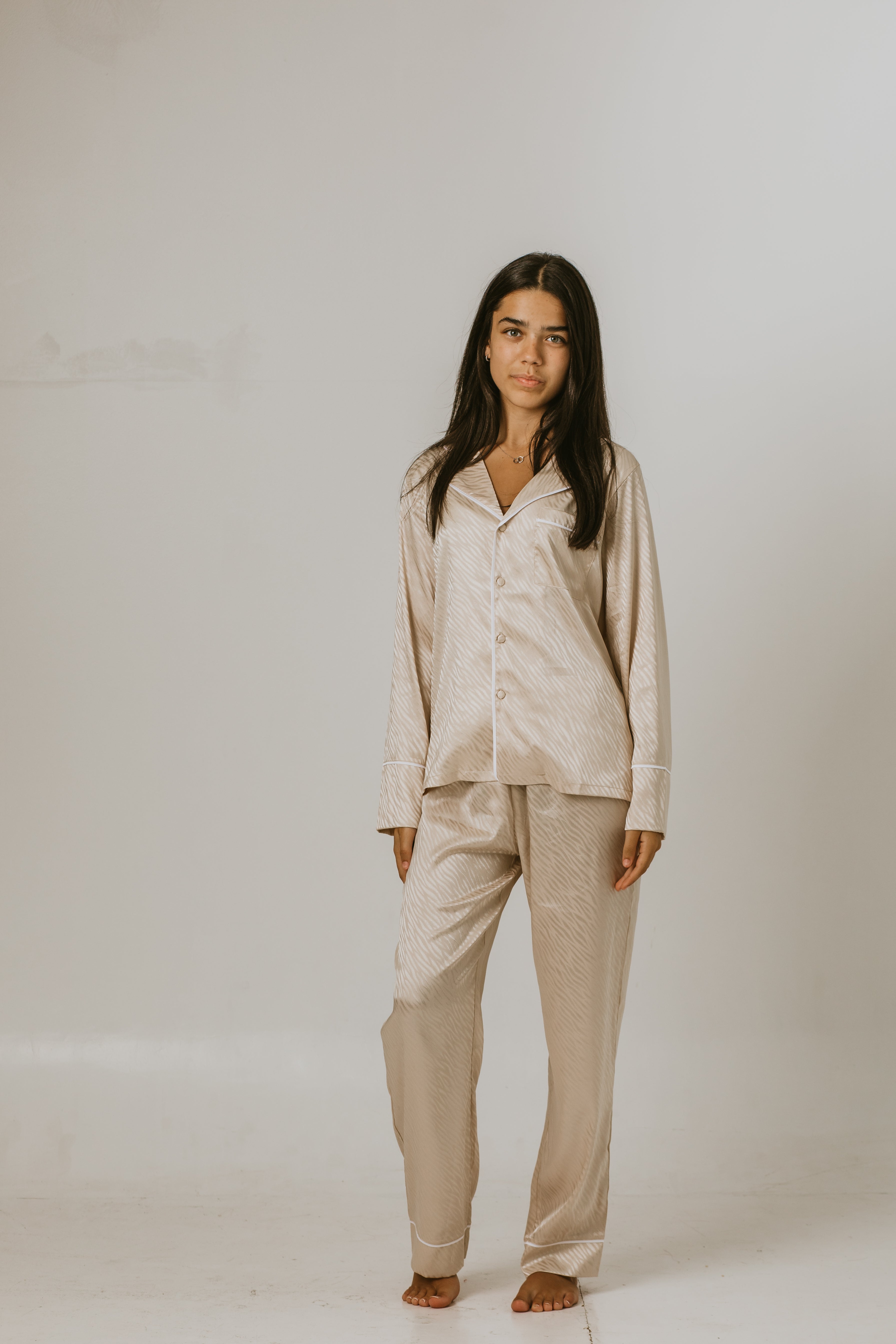 Introducing Our stunning Gold Zebra Print Satin pyjama set. This style has a buttoned down front with white piping to the outer edges, cuffs and ankle area of the pants. For ultimate comfort the pants have an elasticated waist with a ribbon drawstring and two convenient side pockets on the pants, perfect for holding small essentials or lounging in style.