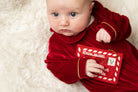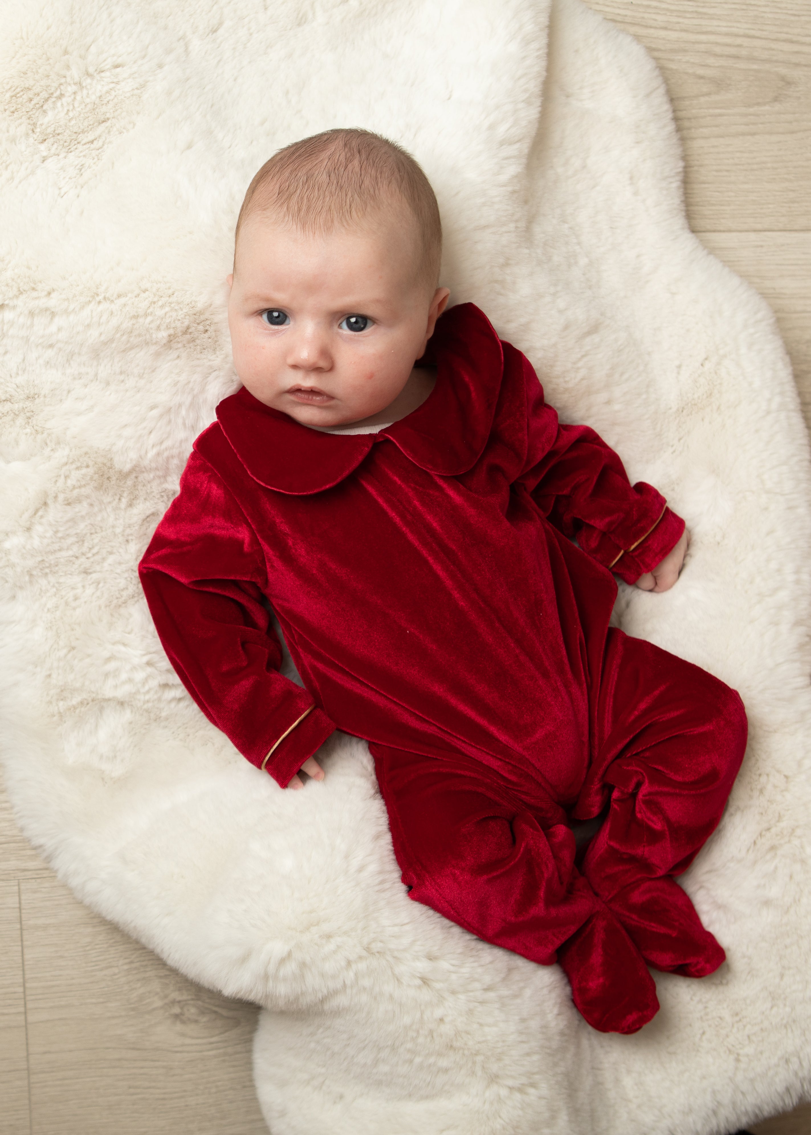 Wrap your Baby Boy's in pure Luxury with our Red and Gold Velvet Baby Grows. New for 2025 they are made from the finest velvet providing a gentle touch against delicate skin. Designed as a cosy one piece it features long sleeves, enclosed feet and easy access snap fastenings for quick changes. It has the added detail of gold piping around the cuffs matching it perfectly to the rest of the collection in children and adults pyjamas whilst also adding that extra charm.