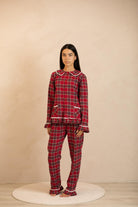 Indulge in Pretty Personal's Traditional Red Tartan collection. Made from soft breathable cotton fabric. Featuring a traditional red and black plaid pattern they have a buttoned-down front with long sleeves and added white lace detail to the outer edges of the collar, around the cuffs, two front pockets and ankle area of the pants. This design is finished with a scalloped edge on both the top and bottom of the pants adding that extra girly touch.